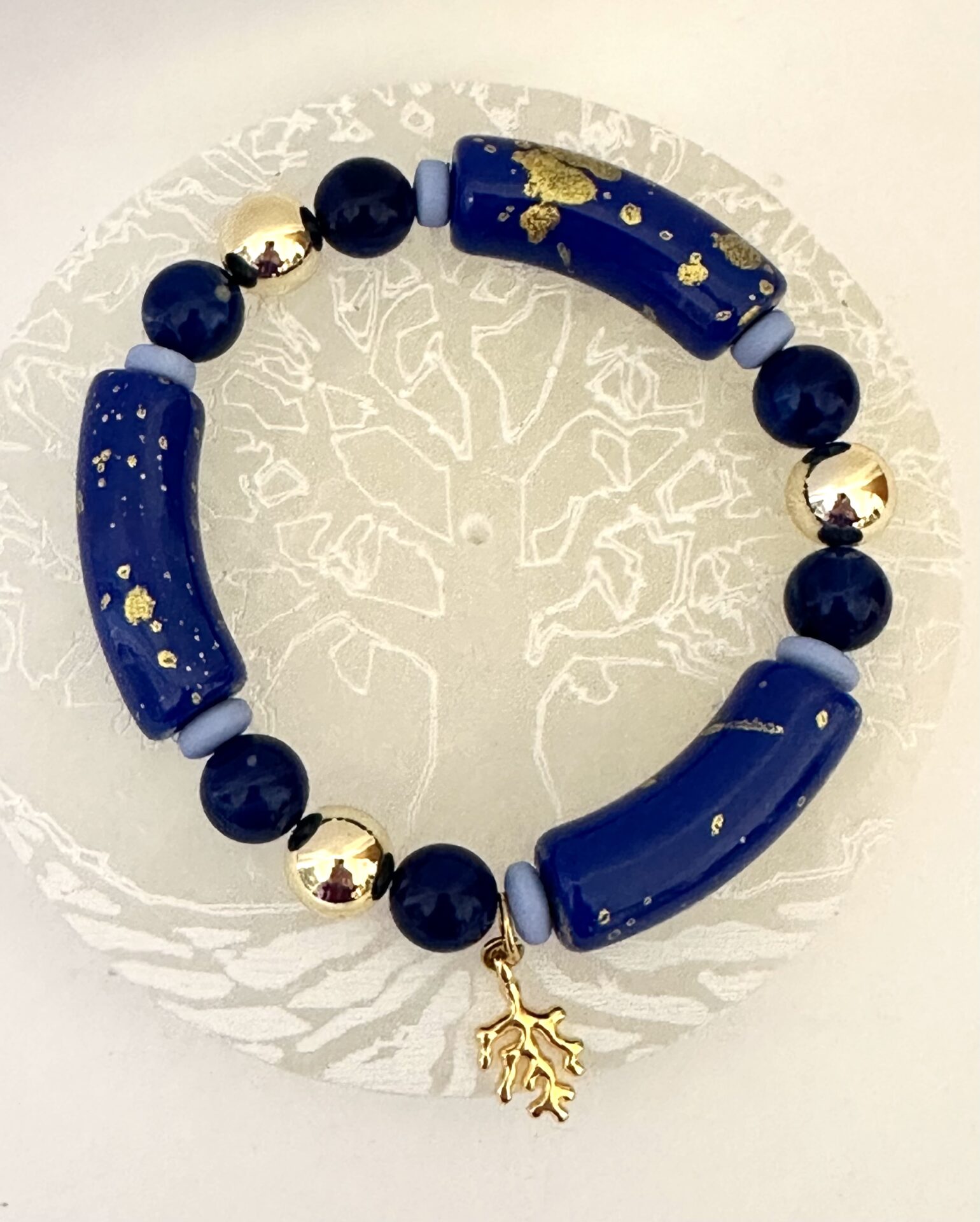 Bracelet perles incurvées bleu et doré perles rondes bleues dorées montage élastique breloque en acier doré corail