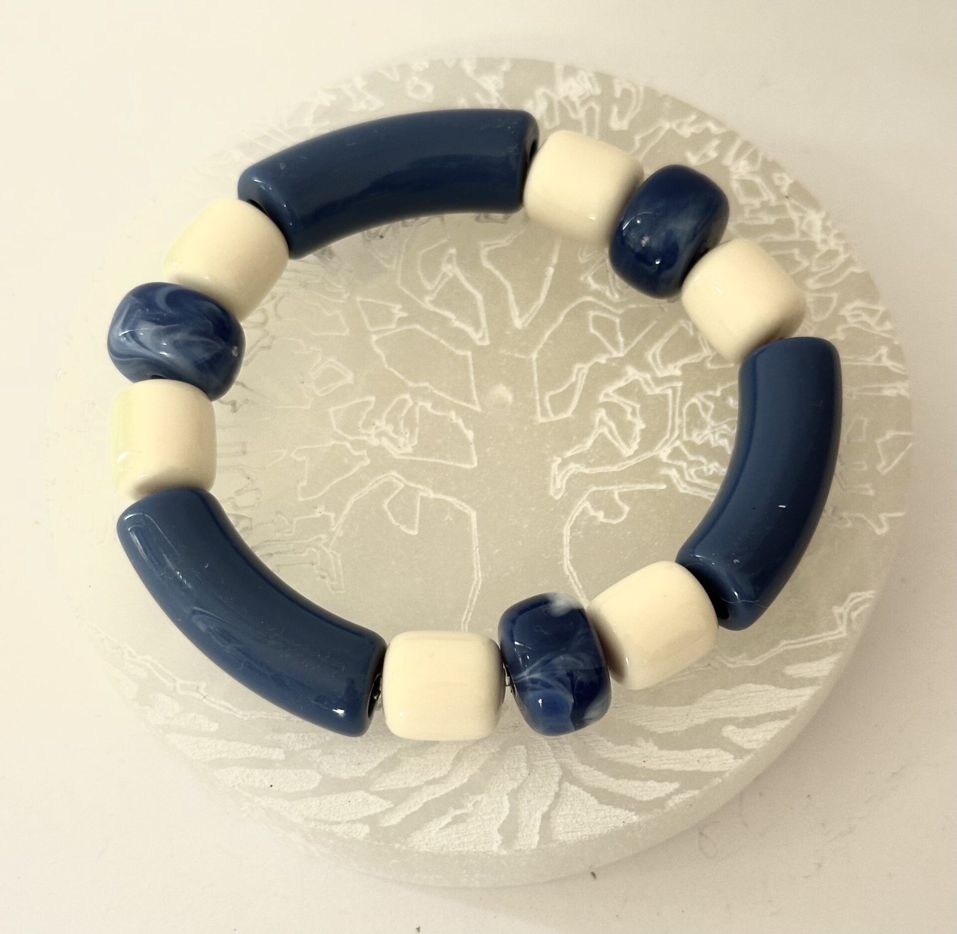 Bracelet perles incurvées bleu perles rondes bleu marbré et crème montage élastique
