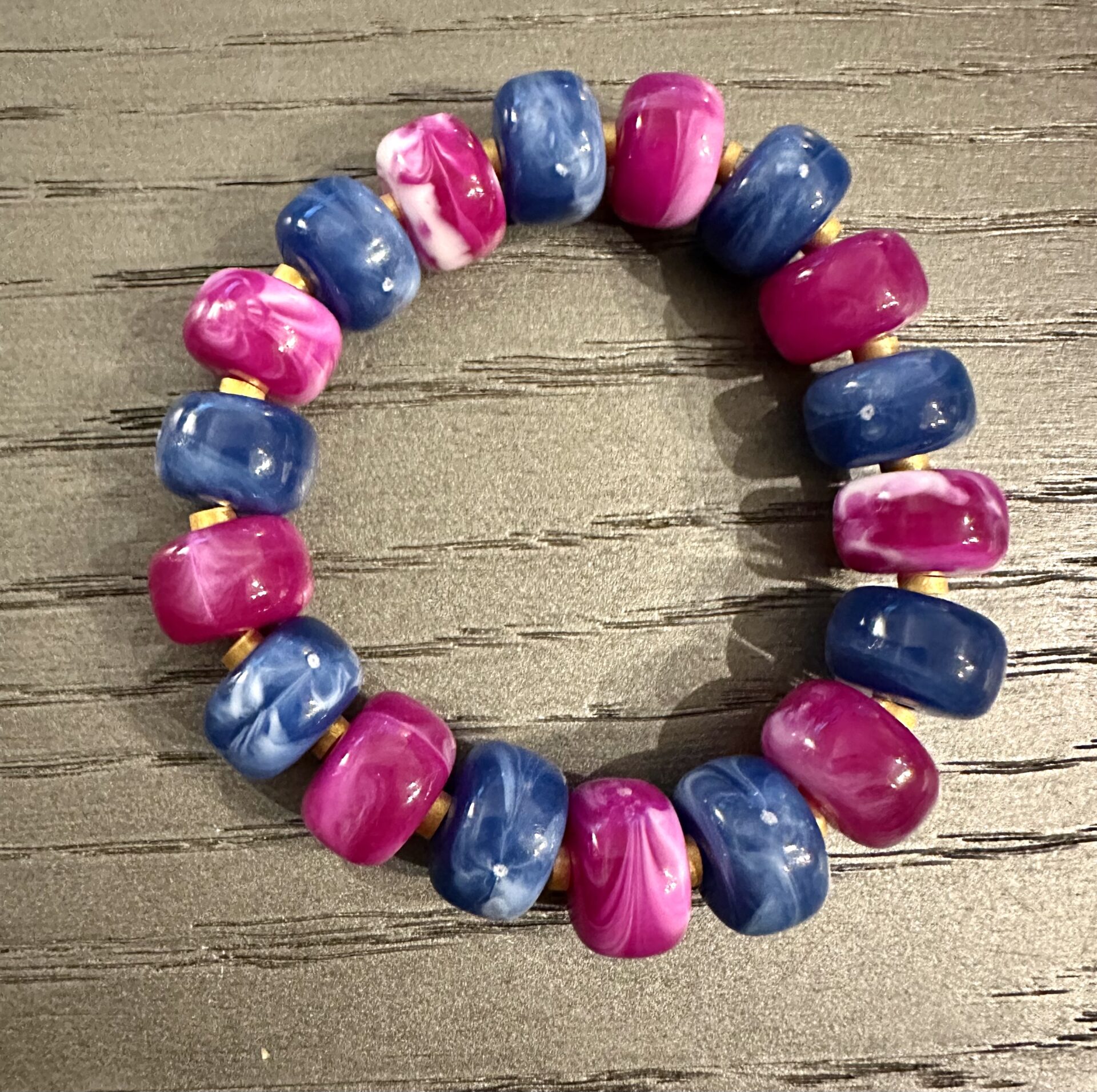 Bracelet Perles rondelles 14.5×9 mm en acrylique – bleu et violet marbré montage sur élastique