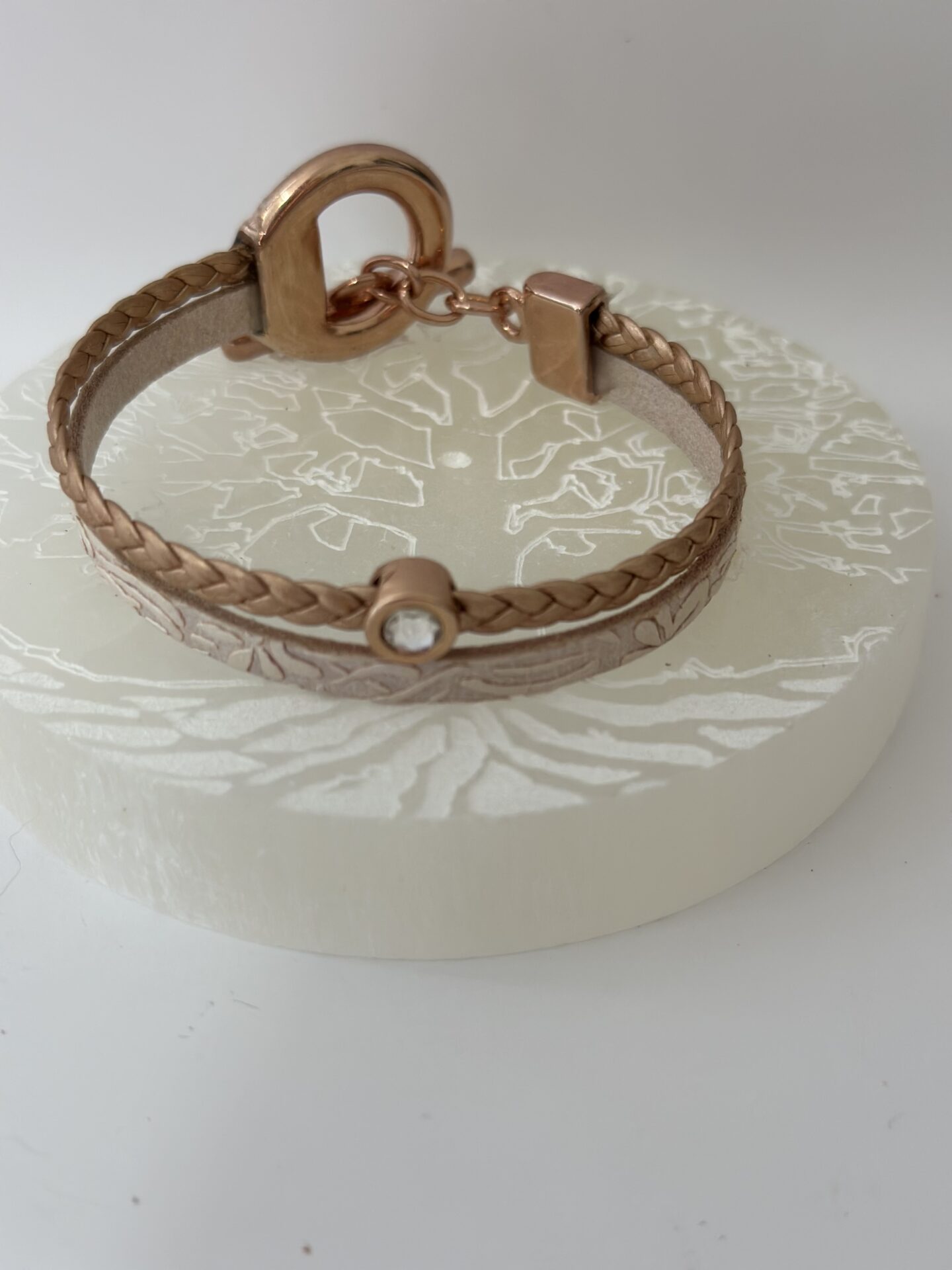 Bracelet 2 rangs cuir écru relief cuir tressé doré rose avec passent crystal fermoir toge doré rose