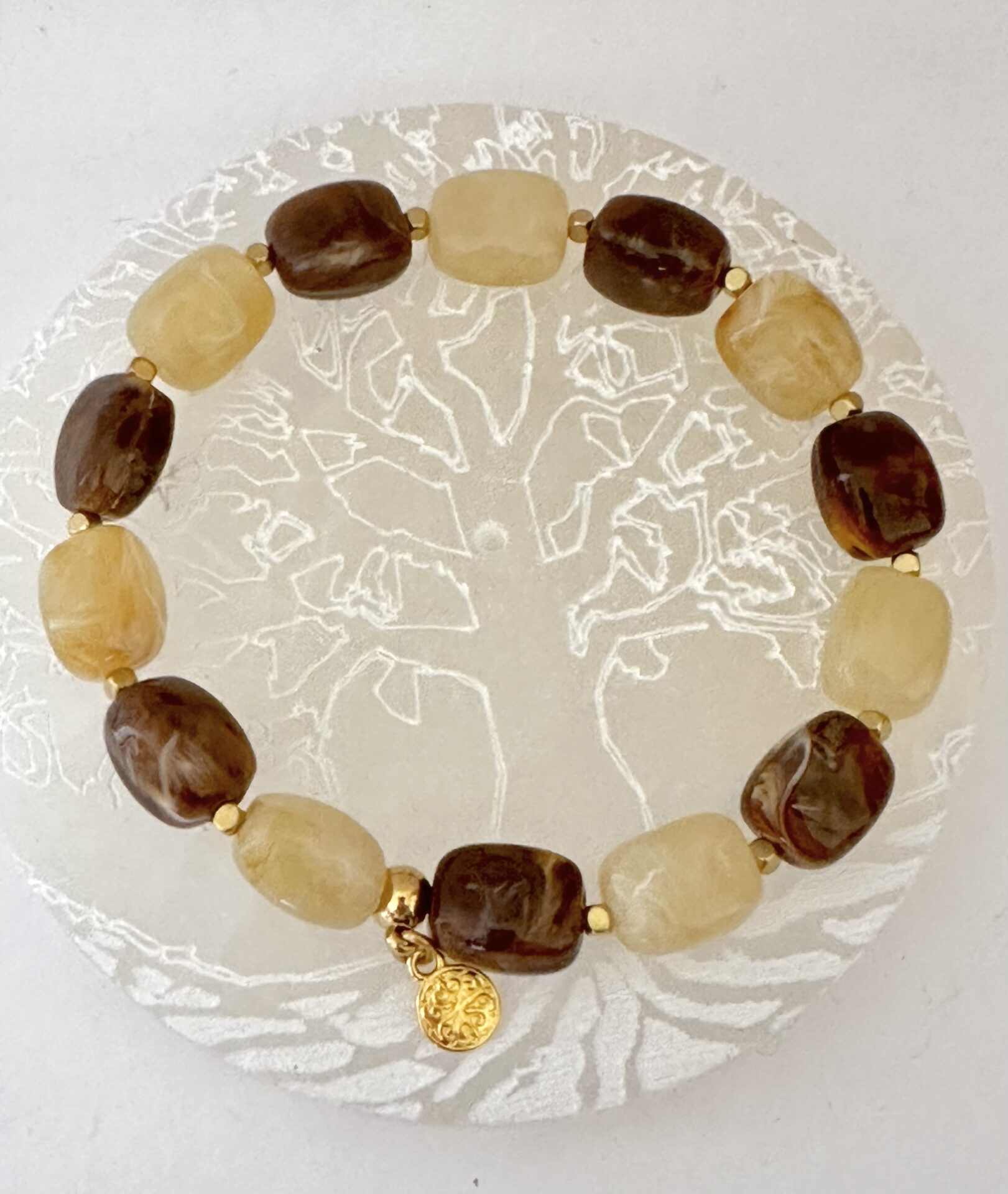 Bracelet perles cubes  11mm marron et beige marbré breloque arbre de vie en acier doré montage sur élastique