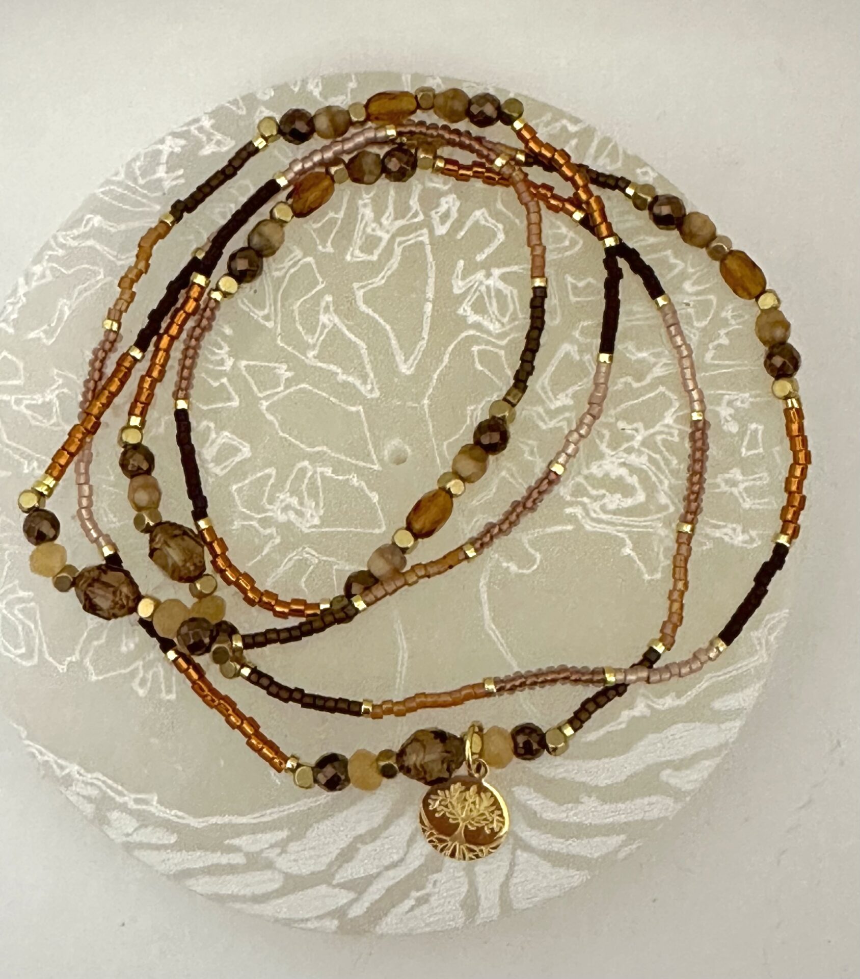 Collier perles cristal de Bohême beige cuivré marron perles de rocailles marron beige doré breloque arbre de vie en acier doré