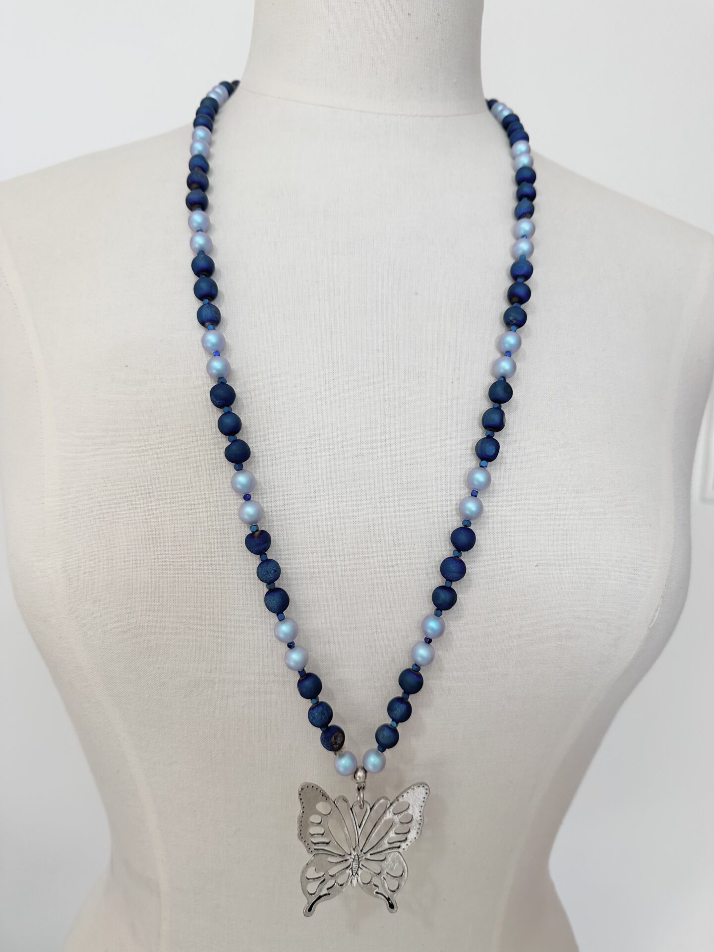 Collier papillon en métal argenté européen perles Swarovski bleu ciel perles agate drudzy bleue foncée et perles intermédiaires hématite bleue