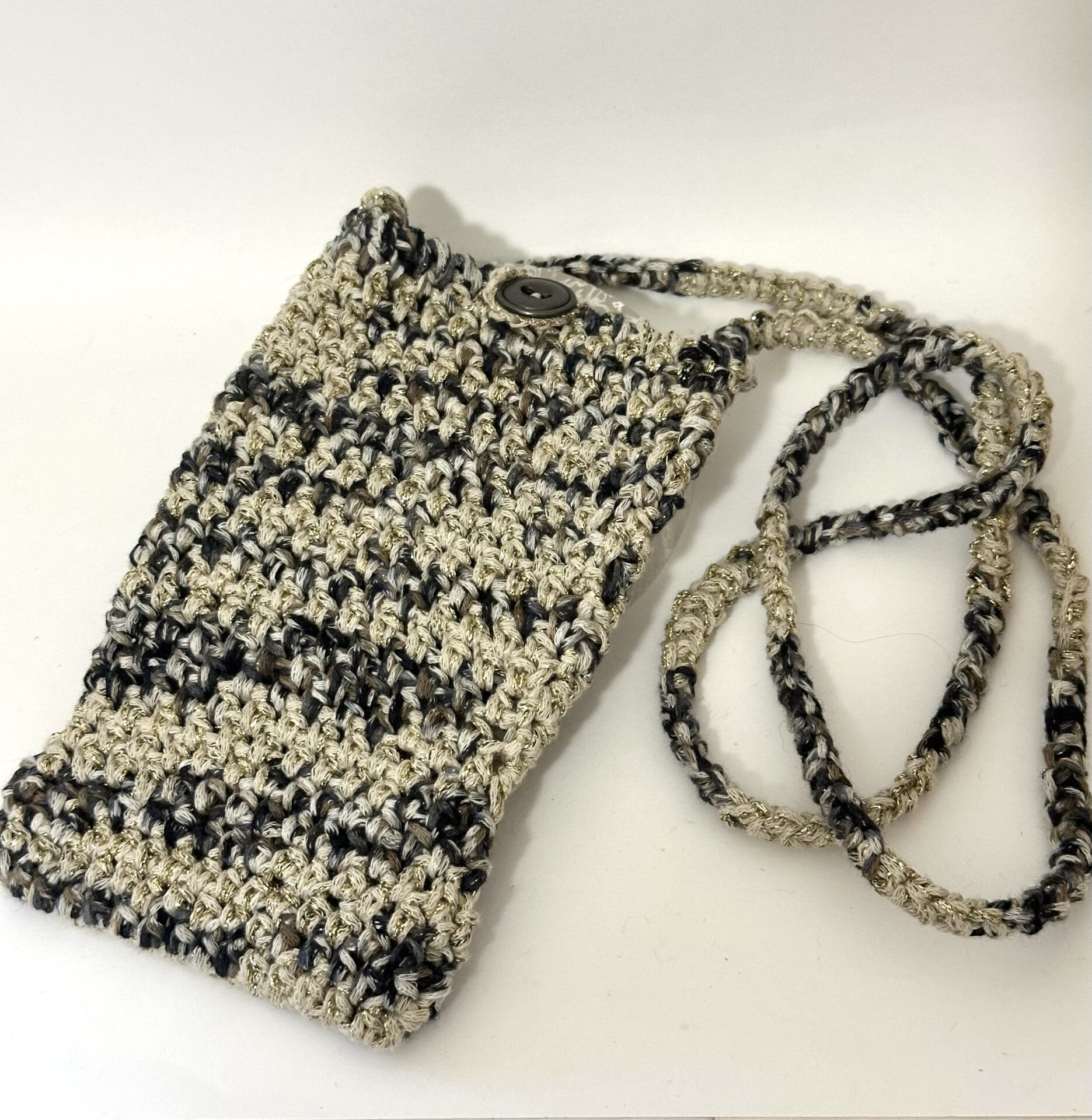 Etui pour portable avec cordon et bouton en coton beige doré noir fabrication artisanale au crochet
