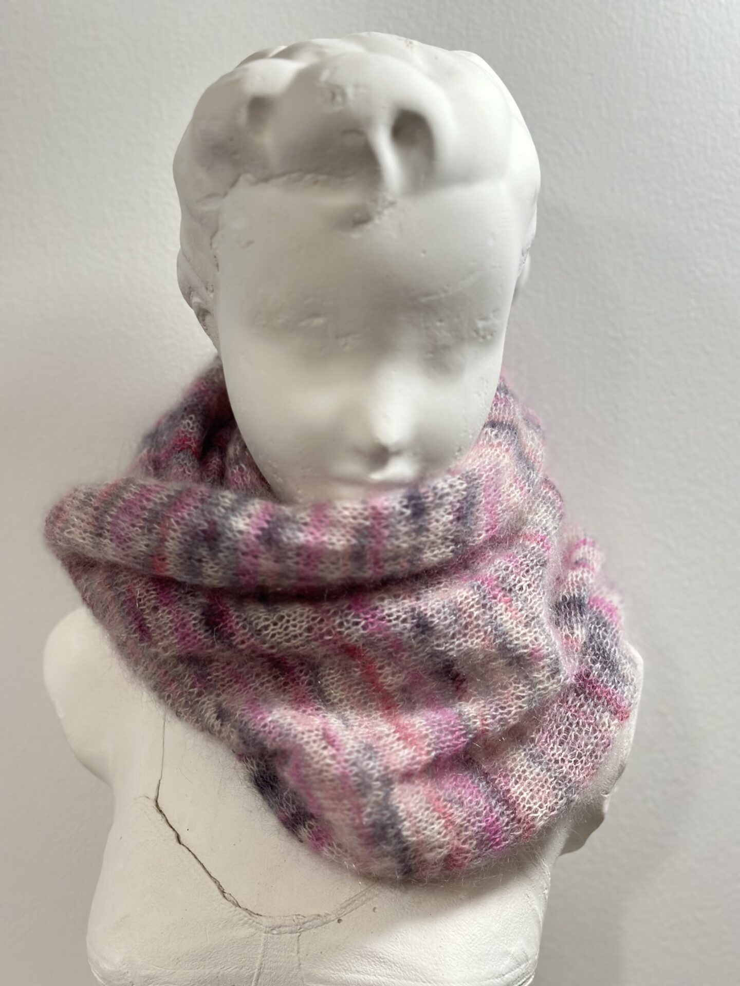 Snood en laine 58% mohair (superkid – 21 MIKRON) traceable / 42% soie blanc gris rose